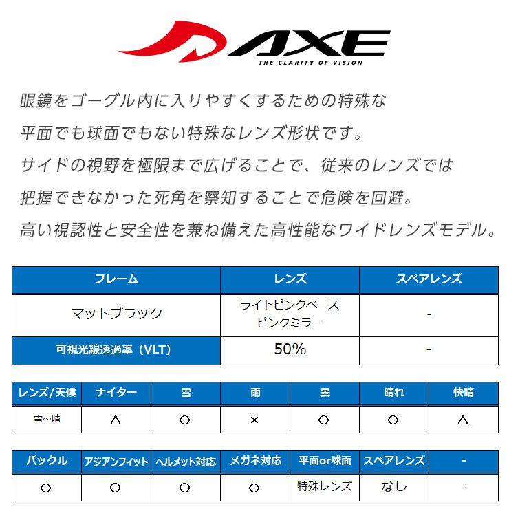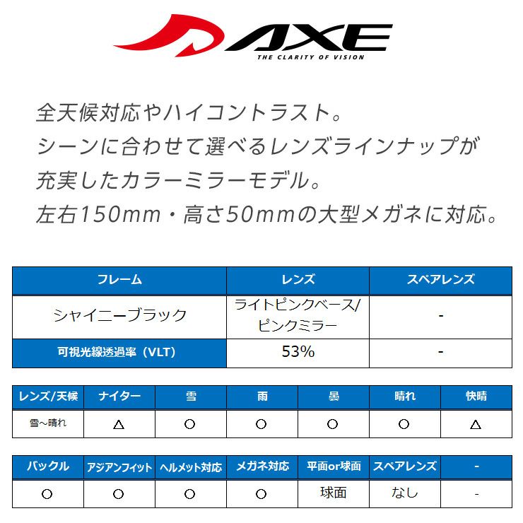 他の画像を見る AXE/アックス AX899-WCM マットブラック レンズ:ライトピンクベース/ピンクミラー 通常価格 ¥ 16,500 のところ セール価格 ¥ 14,289 税込 在庫切れ 詳細を見る お気に入りに登録する