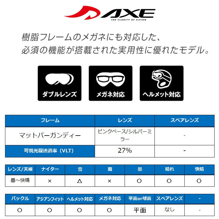 他の画像を見る 軽量&コンパクトなのに広い視界が魅力のレディースモデル AXE アックス OMW-675 ブラック シルバーミラー ゴーグル スノーボード メガネ対応 ヘルメット対応 通常価格 オープン価格 のところ セール価格 ¥ 5,489 税込 在庫切れ 詳細を見る お気に入りに登録する