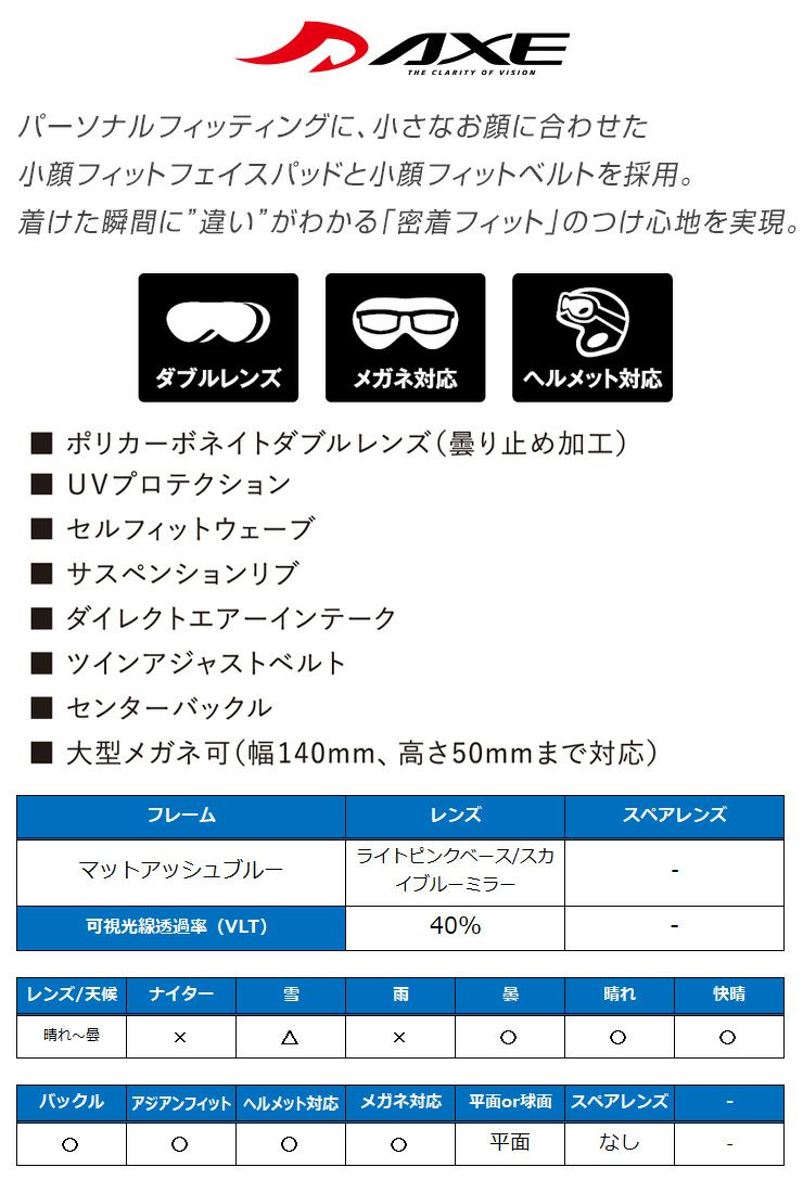 他の画像を見る AXE/アックス AX888-SBU マットマーブルブルー レンズ:ライトピンクベース/スカイブルーミラー 通常価格 ¥ 14,300 のところ セール価格 ¥ 10,989 税込 在庫切れ 詳細を見る お気に入りに登録する