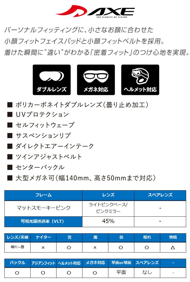 他の画像を見る ヘルメット及びメガネ対応 24-25 AXE アックス AX888-WCM シャイニーブラック レンズ:ライトピンクベース/ピンクミラー ゴーグル スノーボード メガネ対応 ヘルメット対応 通常価格 ¥ 14,300 のところ セール価格 ¥ 10,989 税込 在庫切れ 詳細を見る お気に入りに登録する