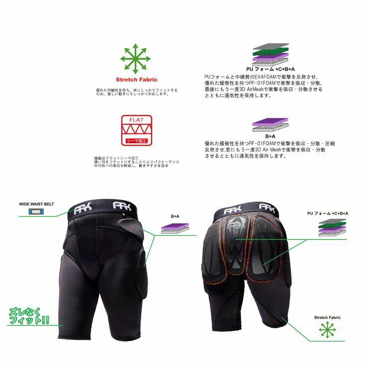 履いた時にパッドとパッドの隙間が開かない外付けパッドをお尻部分に採用しているので、激しい転倒やジャンプ時の転倒にもしっかり対応する大人と同じ仕様の本格プロテクターです。PF-01(ゴム系素材)使用で低温でもパットが硬くならない。2層・3層構造でも蒸れも少なくフィット感抜群で動きやすくゴワゴワしない。縫製はフラットシーマ加工でパフォーマンス中の肌への負担を軽減。パフォーマンス重視のプロテクション。
