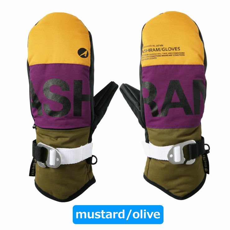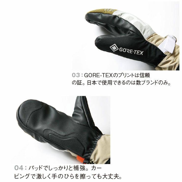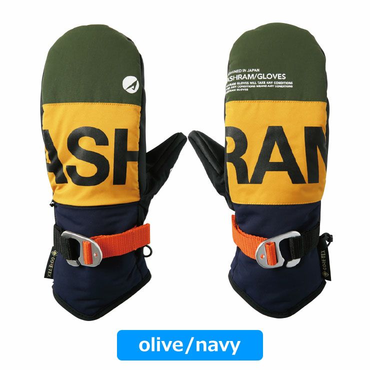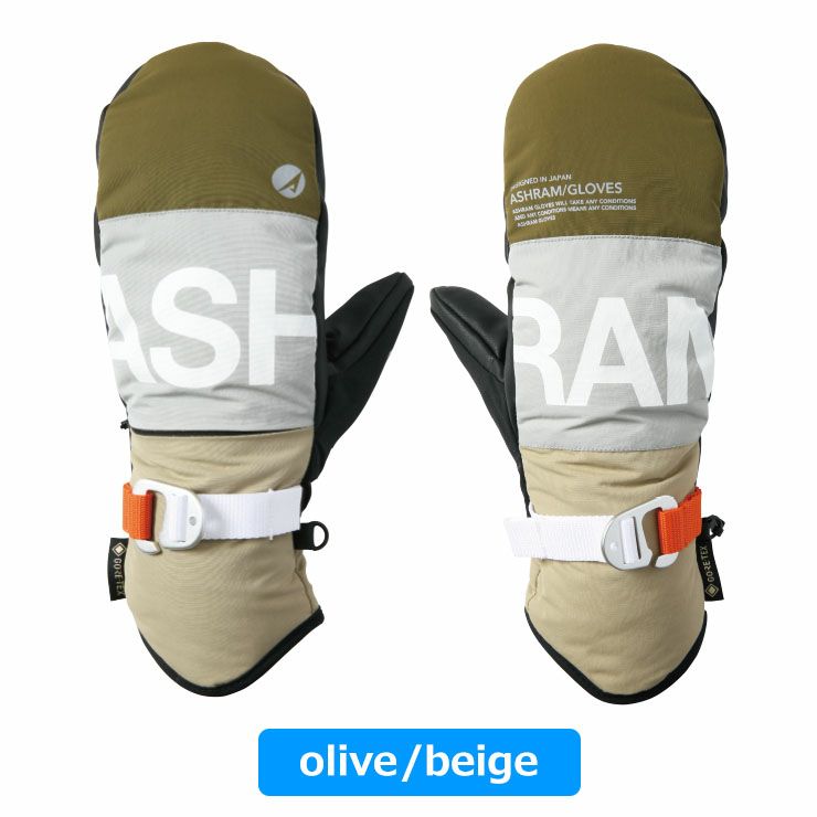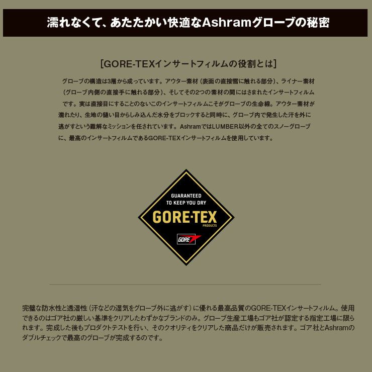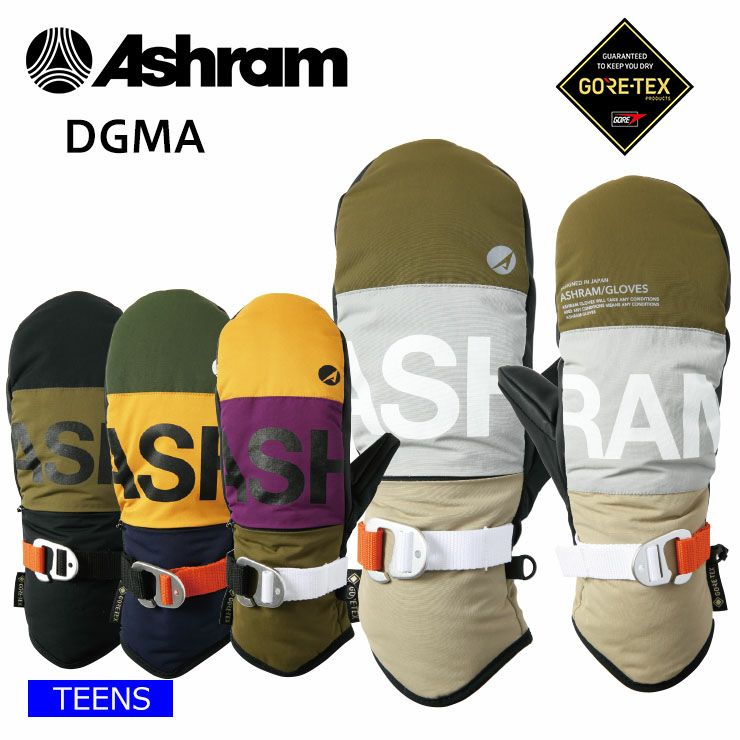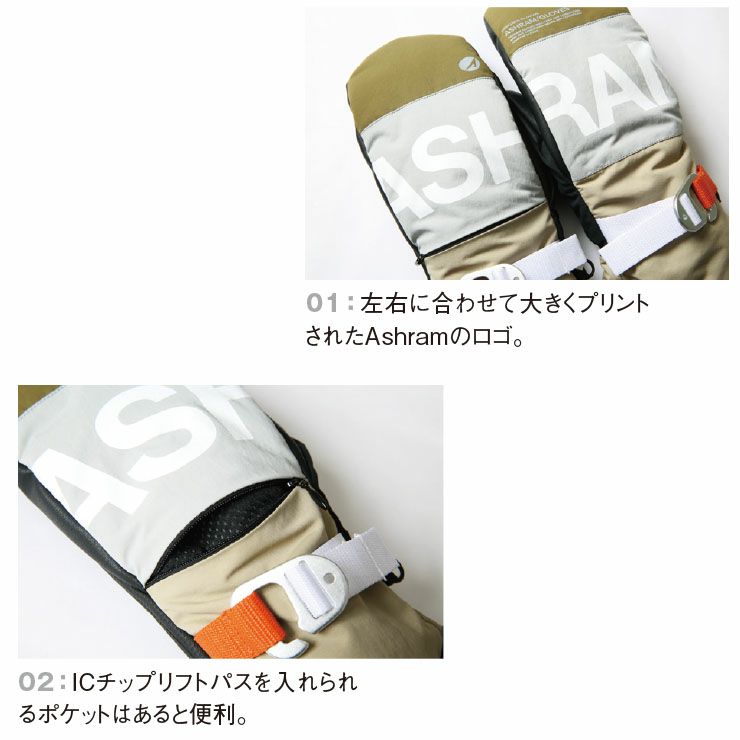 爆発的な人気が続いている「DGMA」。GORE-TEXフィルムを使用した、シンプルでコストパフォーマンスに優れたグローブです。アースカラーをベースに、ライフスタイルに自然と溶け込むようなカラーリングで、雪山でも“普段着の自分”を表現できるでしょう。生地には国産ナイロン生地を使用し、撥水性、耐水圧、透湿性ともにGORE-TEXの設ける基準をしっかりとクリア。左手甲面にはジッパーパスケース、手のひらにはカービングで雪面に手をついた時の衝撃を軽減するパッドを追加、指先の生地を二重にするなど細部をアップデート。最初にAshramを知ってもらうのに間違いなしのベストグローブです。