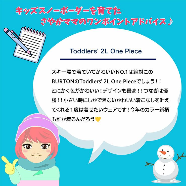 スキー場で着ていてかわいいNO.1は絶対このBURTONのToddlers' 2L One Pieceでしょう!!とにかくいろがかわいい!デザインも最高!!つなぎは優勝!!小さい時にしかできないかわいい着こなしを叶えてくれる1度は着せたいウェアです!今年のカラー新柄も誰が着るんだろう。
