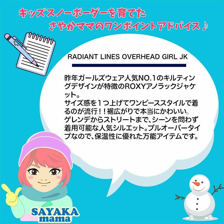 今シーズンの大人ROXYジャケットのトレンドを盛り込んだストリート感満載のボーイズライクなJK!ROXYの可愛さを残しつつ、裾の厚めのゴム絞りがダボっと感をさらに演出!!細めのスタイルから一変!!カジュアルでストリートな新しいROXYスタイルで カッコいいROXYガールズライダーの出来上がり!!