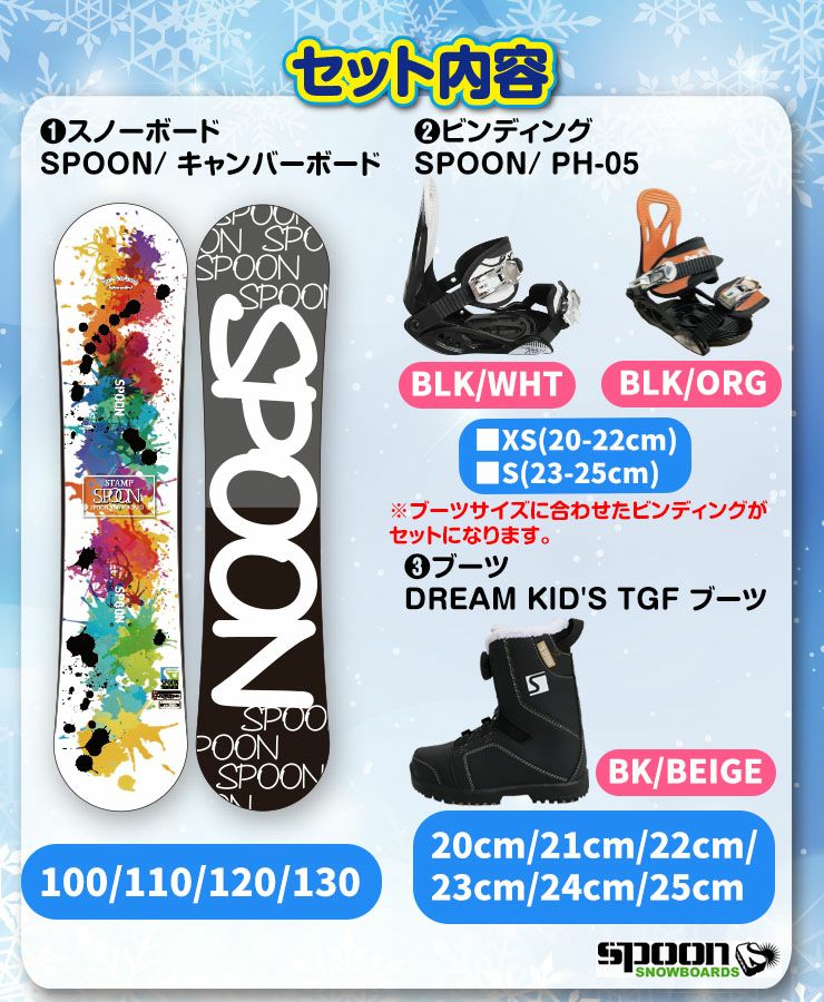 他の画像を見る キッズ スノーボード3点セット SPOON MAGIC スノーボード & PH-05 ビンディング ZUMA ブーツ セール価格 ¥ 36,080 税込 在庫切れ 詳細を見る お気に入りに登録する