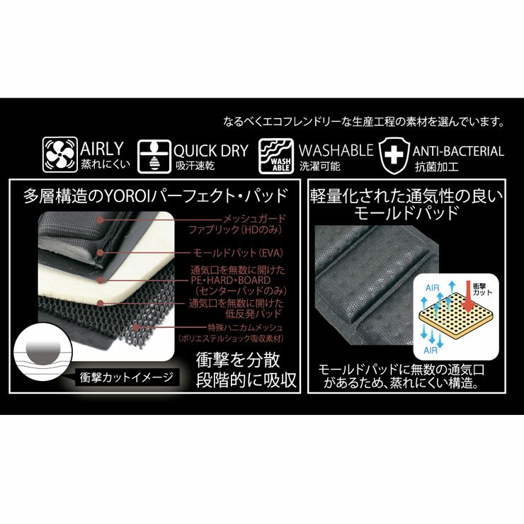 衝撃分散吸収・軽量強靭・通気性抜群です。