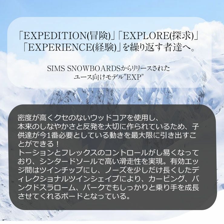 他の画像を見る KIDS JUNIOR 自由自在のライディングを可能にする、オールマウンテンモデル SIMS/シムス EXP 通常価格 ¥ 55,000 のところ セール価格 ¥ 49,500 税込 詳細を見る お気に入りに登録する