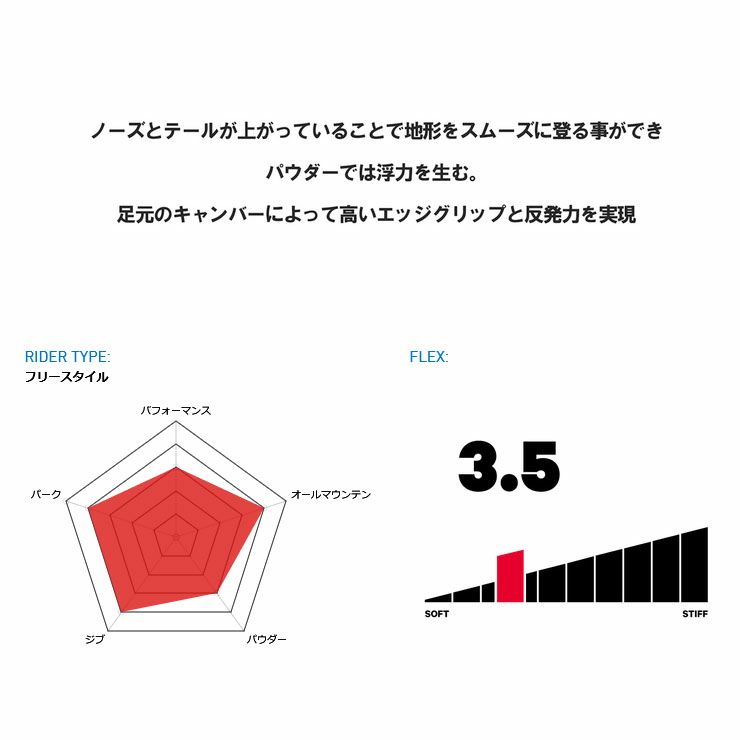 CAPiTA独自のハイブリッド形状によって、1本でフリーラン、パーク、カービング全て出来るボードが完成した。 ノーズとテールが上がっていることで地形をスムーズに登る事ができ、パウダーでは浮力を生む。 更に足元のキャンバーによって高いエッジグリップと反発力を実現。
