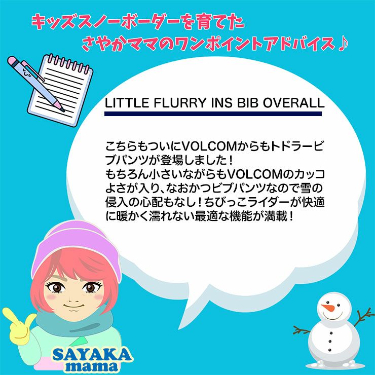 こちらもついにVOLCOMからもトドラービブパンツが登場しました!もちろん小さいながらもVOLCOMのカッコよさが入り、なおかつビブパンツなので雪の侵入の心配もなし!ちびっこライダーが快適に暖かく濡れない最適な機能が満載!