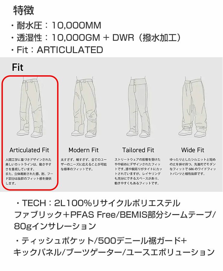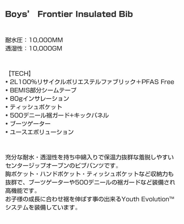 寒い日でも雪の日でも抜群の暖かさをほこり、なおかつシルエットがとてもかっこよくファッショナブルな機能を兼ね備えたビブパンツ。テクノロジーも快適性も、そして完全防水性と通気性も備え、クラシックなスタイルを表現でき、今シーズン復刻されたBOYS SNAGGLETOOTH OWEN INSULATED JACKETとセットで着れるようなカラーリングになっている。 Youth Evolution?システムを搭載し、成長とともに脚の長さを調節しフルサイズに伸ばすことができます。