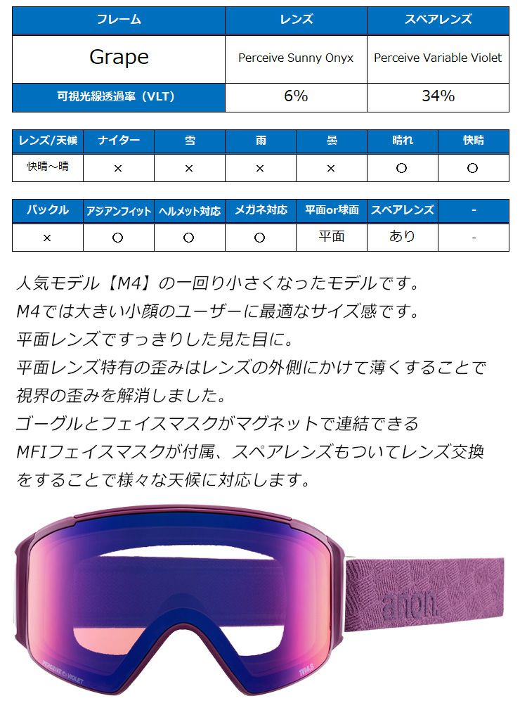23-24 正規品 アジアンフィット ヘルメット対応 2024 anon アノン スノーボード ゴーグル M4S Cylindrical Low Bridge カラー : Grape レンズ:Perceive Sunny Onyx スキー 磁石式